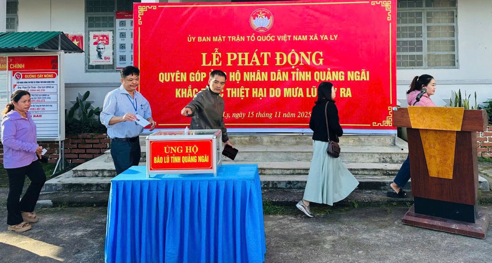 Thực hiện sự chỉ đạo của Ban Thường vụ Đảng ủy tại Công văn số 164 -CV/ĐU ngày 05 tháng 11 năm 2025 về việc triển khai vận động ủng hộ Nhân dân tỉnh Quảng Ngãi khắc phục thiệt hại do mưa lũ gây ra; Thư Ngỏ của Ủy ban Mặt trận Tổ quốc Việt Nam tỉnh về việc ủng hộ Nhân dân trên địa bàn tỉnh Quảng Ngãi khắc phục thiệt hại do mưa lũ gây ra. Sáng ngày 15/11/2025; Uỷ ban Mặt trận Tổ quốc Việt Nam xã tổ chức Lễ phát động ủng hộ Nhân dân tỉnh Quảng Ngãi khắc phục thiệt hại do mưa lũ gây ra