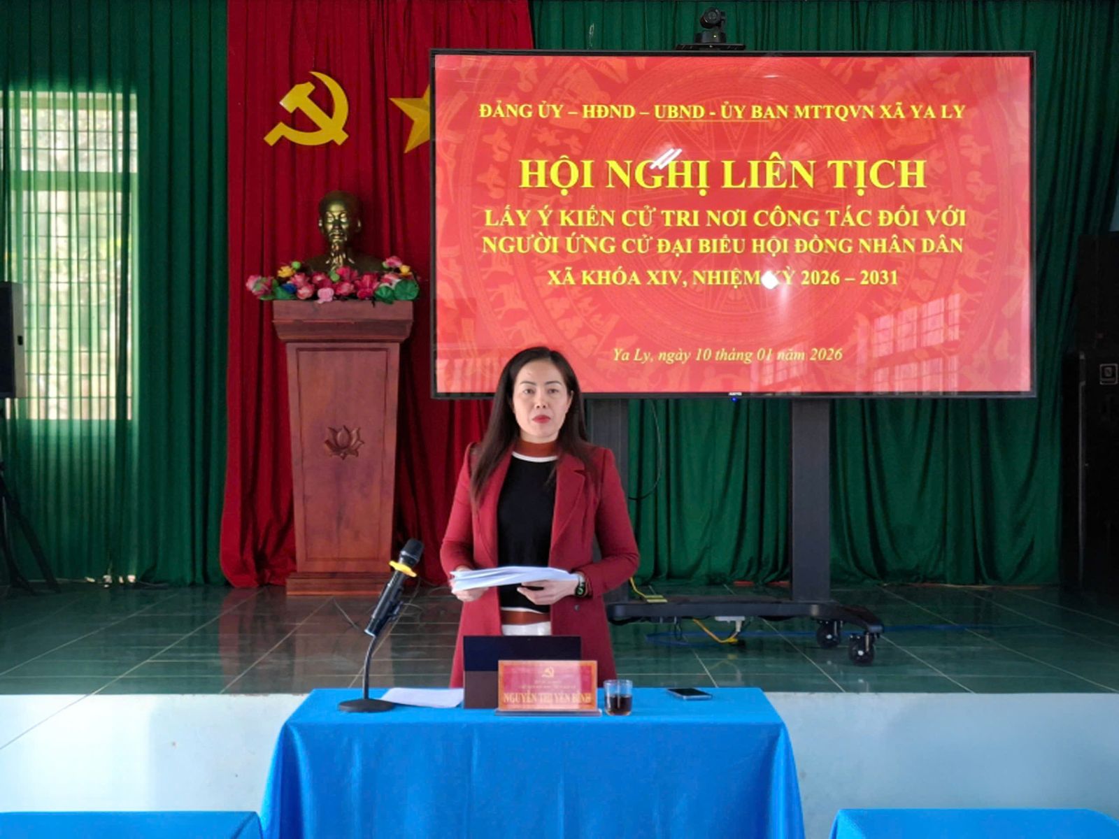Tại hội nghị, Thường trực HĐND xã đã thông tin, giới thiệu chung về tiêu chuẩn của người ứng cử đại biểu HĐND các cấp nhiệm kỳ 2026 - 2031, đại diện lãnh đạo UBMTTQVN xã thông qua danh sách 16 ông, bà được giới thiệu ứng cử đại biểu HĐND xã theo đúng quy định của Luật Bầu cử và hướng dẫn của Ủy ban MTTQ Việt Nam các cấp. Hội nghị cũng tiến hành lấy ý kiến nhận xét, đánh giá của cử tri nơi công tác đối với người được giới thiệu ứng cử. Các ý kiến phát biểu thể hiện tinh thần trách nhiệm, dân chủ, khách quan, tập trung nhận xét về phẩm chất chính trị, đạo đức, lối sống, năng lực công tác và uy tín của người ứng cử. Trên tinh thần dân chủ, thẳng thắn và trách nhiệm, 100% cử tri tham gia hội nghị đã biểu quyết nhất trí với danh sách những người được giới thiệu ứng cử đại biểu HĐND tỉnh và đại biểu HĐND xã Ya Ly khóa II, nhiệm kỳ 2026 - 2031.