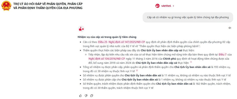 Ví dụ, muốn tìm thông tin về việc cấp xã có nhiệm vụ gì trong quản lý tiêm chủng tại địa phương, nếu sử dụng các công cụ tìm kiếm sẽ cho ra gần 2 triệu kết quả với nhiều nội dung khác nhau, không có câu trả lời rõ ràng và chính xác theo quy định pháp luật. Trợ lý ảo cán bộ công chức sẽ cung cấp câu trả lời đúng trọng tâm kèm theo dẫn chứng các văn bản pháp luật có liên quan.