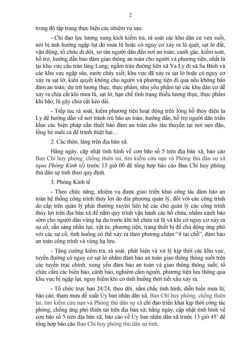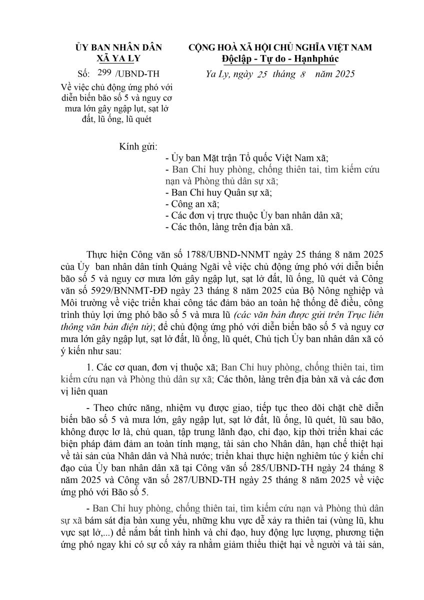 Ủy ban nhân dân xã Ya Ly vừa ban hành Công văn số 299/UBND-TH, ngày 25/8/2025 về việc chủ động ứng phó với diễn biến bão số 5 và nguy cơ mưa lớn gây ngập lụt, sạt lở đất, lũ ống, lũ quét trên địa bàn xã